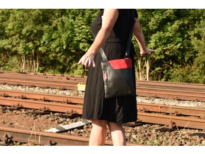 Dámská kožená kabelka v černo červené barvě, vyrobená ručně z přírodní kůže.